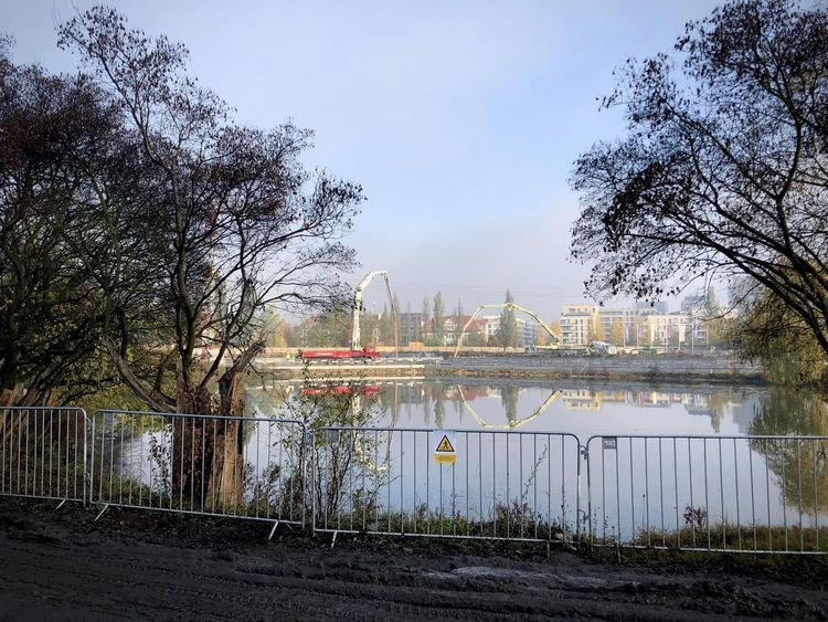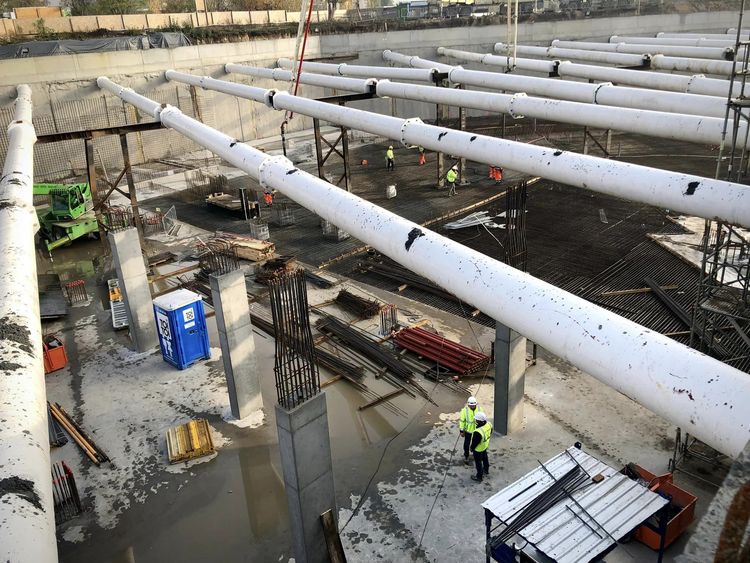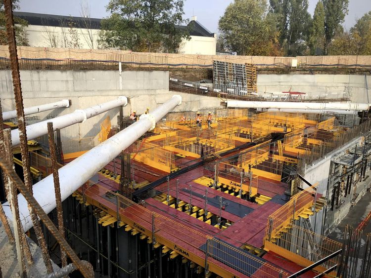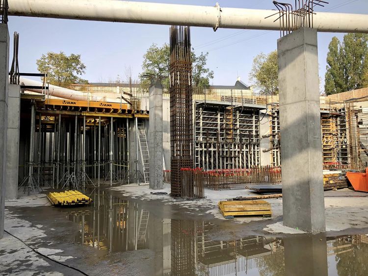 Przy inwestycji zakończyły się prace przy wykopie i jego zabezpieczeniu. W podziemnej części budynku kontynuowane jest zbrojenie i betonowanie żelbetowej płyty fundamentowej. W gotowej części wykonywane są również żelbetowe słupy podziemnych kondygnacji, które pomieszczą między innymi parking. Trwają przygotowania do wylania pierwszej części stropu rozdzielającego dwie najniższe kondygnacje.