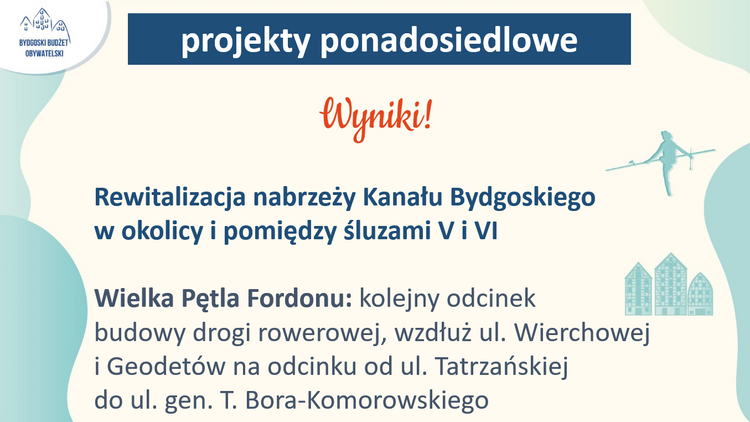 Sporym zainteresowaniem cieszyły się projekty ponadosiedlowe. Autor projektu dla swojego pomysłu musiał uzyskać akceptację przynajmniej trzech rad osiedla. Najwięcej – 2673 głosów - zdobyła rewitalizacja Parku nad Starym Kanałem Bydgoskim pomiędzy V i VI śluzą. Pozwoli to kontynuować prace rozpoczęte w ostatnich latach. Drugim zwycięskim projektem jest kolejny etap Wielkiej Pętli Fordonu – zlecimy zaprojektowanie i budowę następnego odcinka trasy rekreacyjnej na odcinku wzdłuż ul. Wierchowej i Geodetów, na odcinku od ul. Tatrzańskiej do ul. gen. T. Bora-Komorowskiego (projekt uzyskał 2469 głosów).