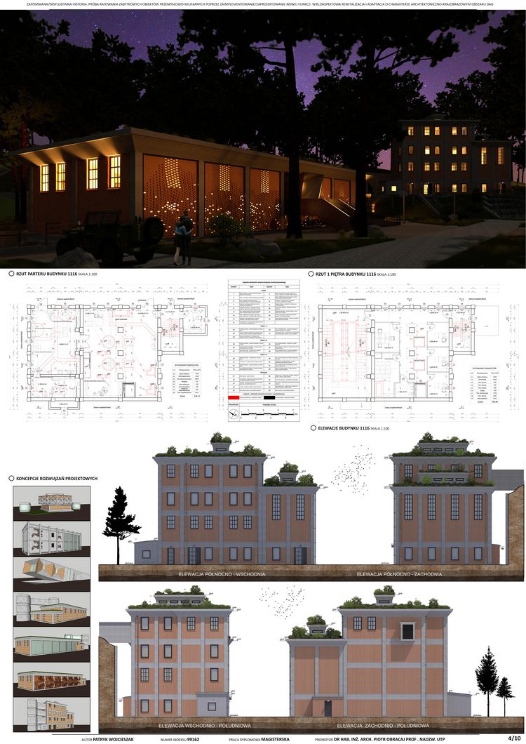 I miejsce - 7 tys. zł brutto - Patryk Wojcieszak „Zapomniana/ekspozywna historia. Próba ratowania zabytkowych obiektów przemysłowo-militarnych poprzez zaimplementowanie/zaprojektowanie nowej funkcji. Wieloaspektowa rewitalizacja i adaptacja o charakterze architektoniczno-krajobrazowym obszaru DAG Fabrik Bromberg.” (PBŚ)