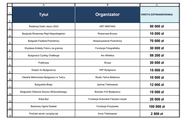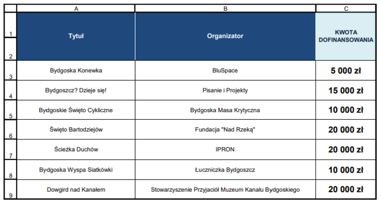 W tegorocznej edycji konkursów wpłynęło 50 wniosków – 32 w ramach „Bydgoszcz Zaprasza” i 18 w ramach „Bydgoszcz. Dzieje się!”. Po analizie merytorycznej i ocenie wartości promocyjnej złożonych wniosków pozytywną decyzję o dofinansowaniu uzyskało 13 wniosków złożonych w ramach „Bydgoszcz Zaprasza” i 7 w ramach „Bydgoszcz. Dzieje się!”.